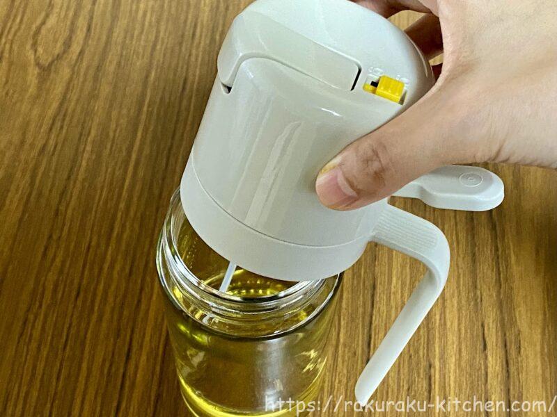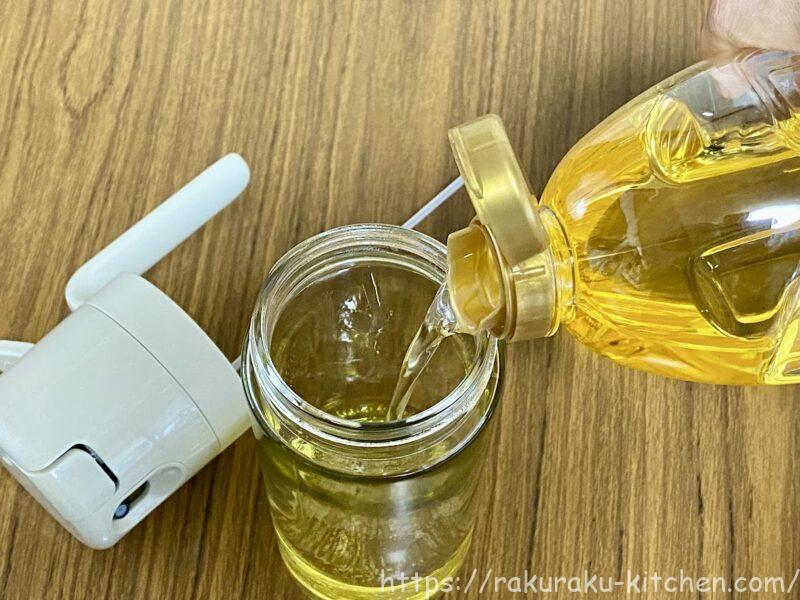 容量は500mlまでが適量です。500mlといったらペットボトルと同じなので、この手の容器にしては大容量です。我が家ではそんなにスプレーボトルではたくさん油を使わないので、200ml程度しか入れていませんが、うまくスプレーできます。少量の油しか入っていなくてもスプレーが使えるのは便利です。