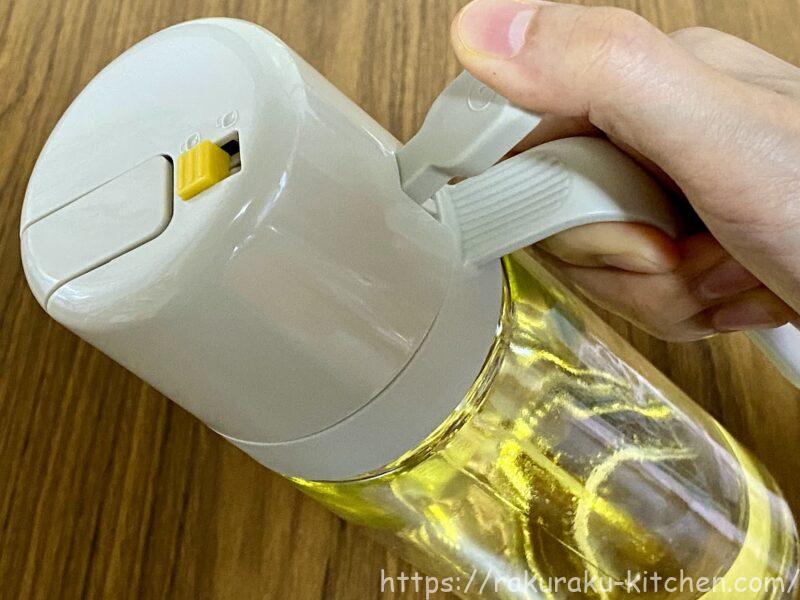 フタ部分に黄色い四角がありますが、これはロック(スプレー式)とロック解除(注ぐ)を切り替えるためのものです。これを切り替えることで、『スプレー』と『注ぐ』を切り替えることができます。