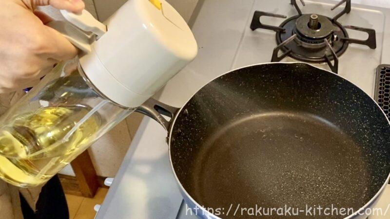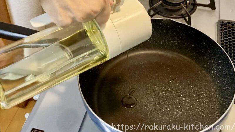 下記画像は「注ぐ」で油をフライパンに注いでいる状態です。液だれすることがないので、ストレスなく油を注ぐことができます。
