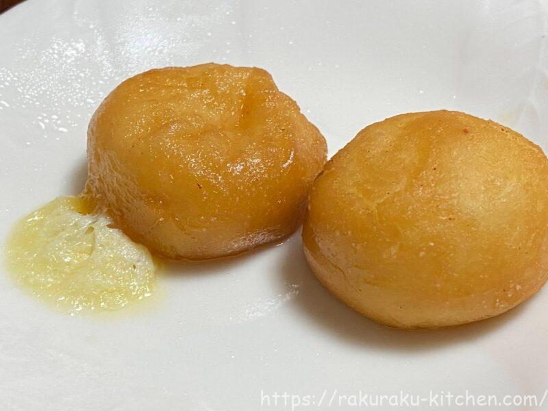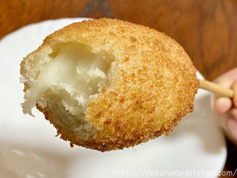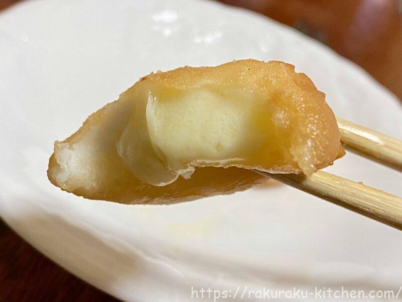 中にチーズが入っています。商品写真のようるにとろーりと長く伸ばすのは難しかったですが、確かにチーズは少し伸びました(笑)。