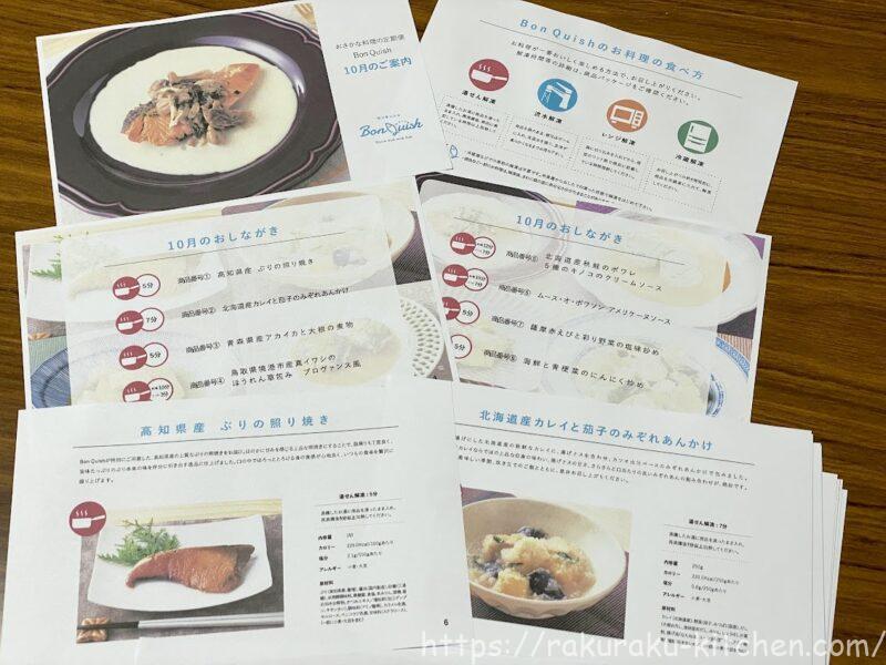 それぞれの料理の作り方、盛り付け写真などがカラーの紙に印刷されています。これはとても便利です。