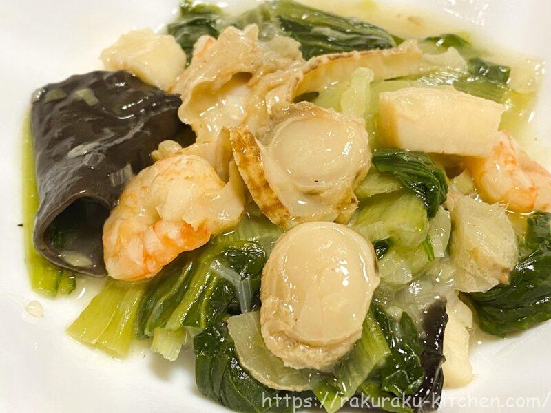 国産のエビ、イカ、ホタテと、葉が柔らかく香りが優しい旬の青梗菜を使った中華料理です。