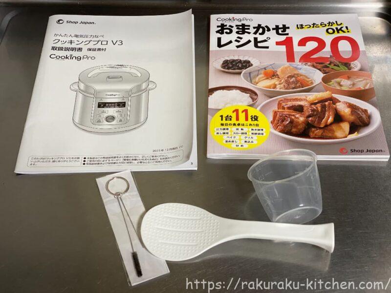 取扱説明書、おまかせレシピ100、しゃもじ、計量カップ、お手入れ用ピンが付属しています。