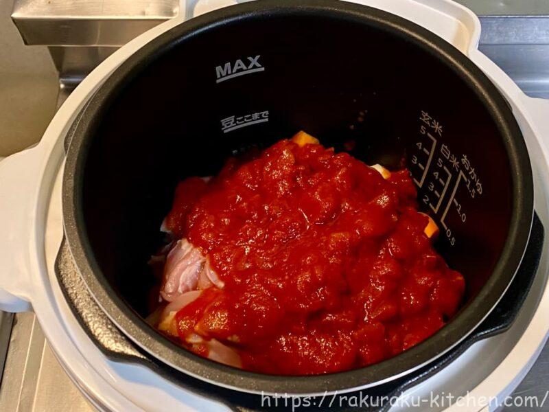 鍋に材料(鶏肉、人参、玉ねぎ、じゃがいも、トマト缶)を入れます。