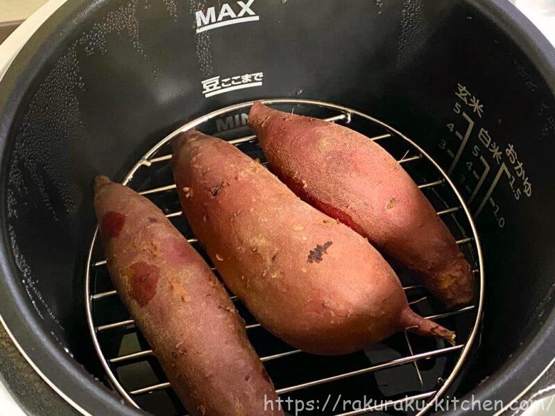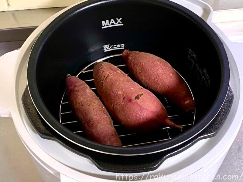 鍋に水を入れて、「専用2段蒸しラック(別売)」の上にさつまいもをのせます。専用ラックでなくても、高さがあるものを使えば大丈夫です。