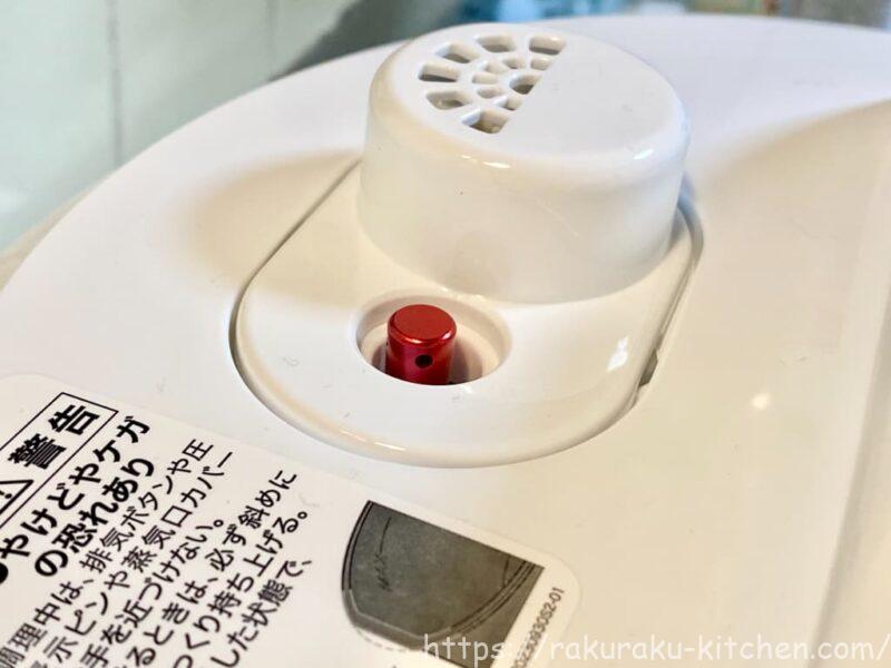 圧力調理が開始されると、赤色の圧力ピンが上に上がります。ピンが下がって(減圧)からフタを開けます。