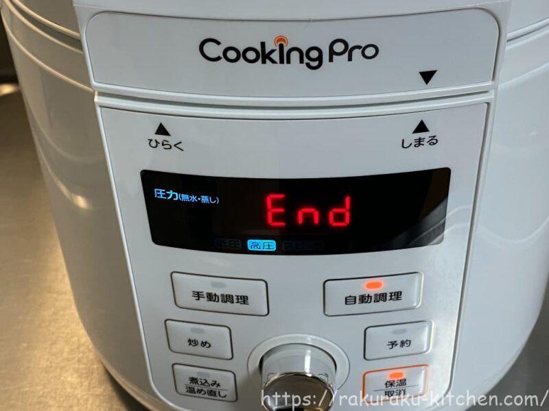 ENDが表示されたら完成。フタを開けて鍋から取り出します。