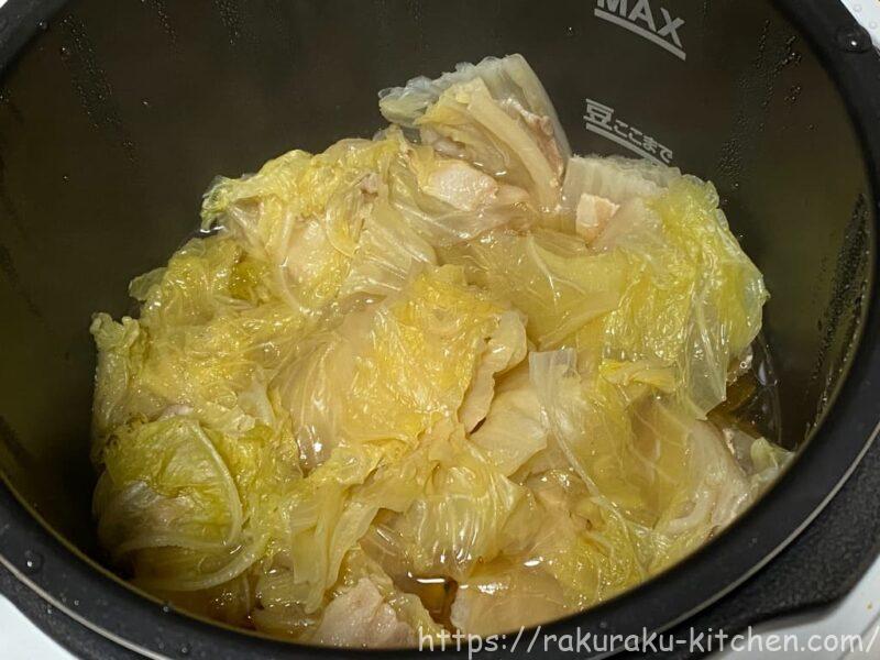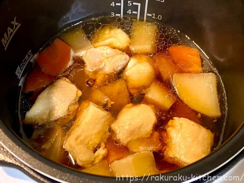 圧力調理完了後、フタを外して【煮込み】ボタンを押して、3分煮込んで完成!