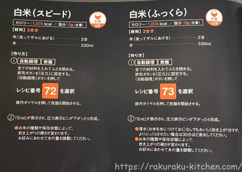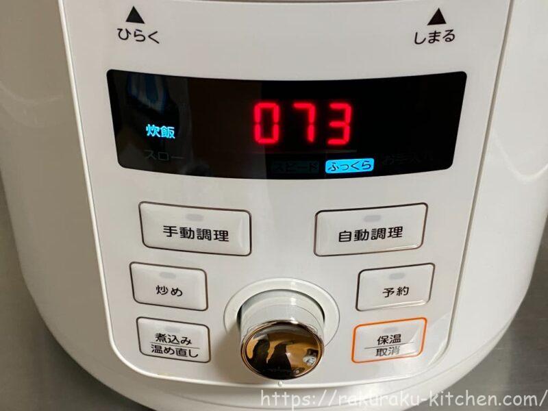 73番を選択すると「炊飯 ふっくら」と液晶パネルに表示されます