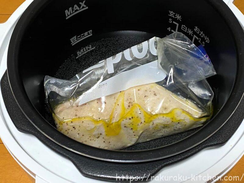 サラダチキンは低温で一定時間調理するスロー調理です。ポリ袋に鶏むね肉、オリーブオイル、塩を入れて袋を閉じます。水をいれた鍋に袋ごと入れます。