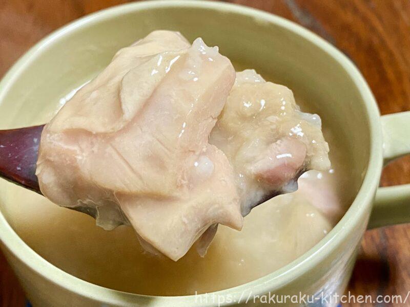 こんな感じの1口大の鶏肉がゴロゴロ入っているので食べ応えがあります。骨は完全に取り除かれているのですべて食べることができます。