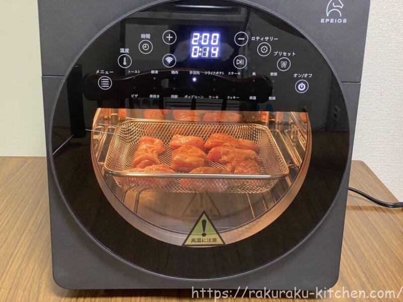 エペイオスのノンフライオーブンは従来のノンフライヤーに比べるとかなり庫内が広く、形がオーブンのように四角いので使いやすいです。また、回転機能などもありエンターテイメント性もあります。