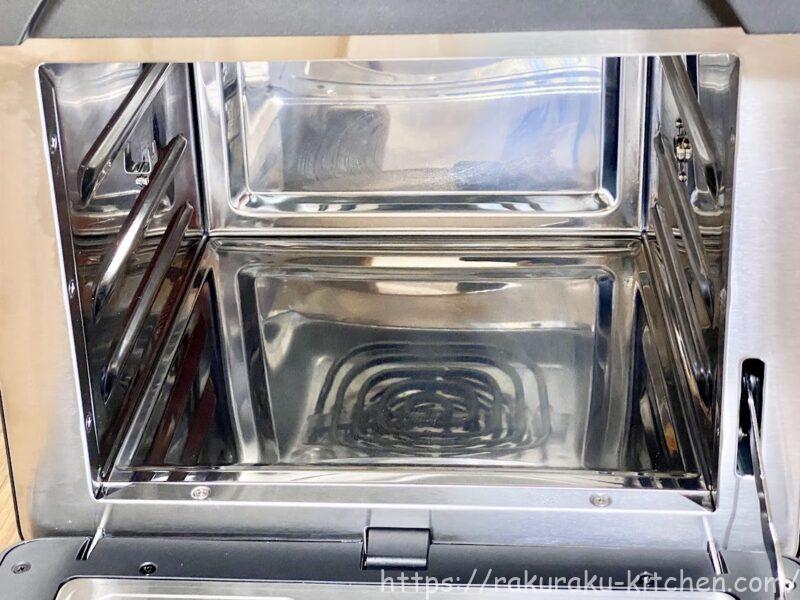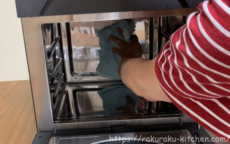 オーブン自体のお手入れはとても簡単です。庫内はフラットになっていて、凸凹なども全くないので布きんなどでさっとふき取るだけです。