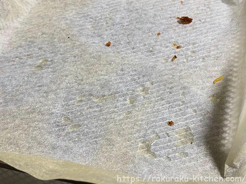 下の写真はクッキングシートを敷いて鶏肉を焼いたときのものです。脂はすべてクッキングシートでカバーでき、メッシュバスケットは全く汚れませんでした。