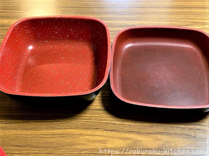 ディープパンは使用頻度が低いためいまだにとてもキレイで、コーティングも全然剥げていないので油なしでも全然くっつきません。