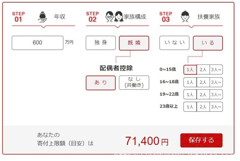 ▼例えば年収600万の人だと71,400円が寄付上限額目安とでてきます