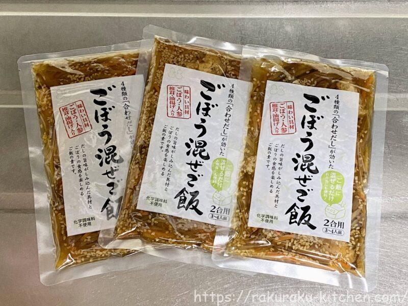 ごぼう混ぜご飯3個セットです(138g×3個)。加圧加熱殺菌されているので期限は長いです(半年以上)。