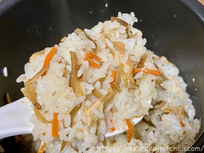 炊きあがったごはん2合に1袋をいれて、よく混ぜます。汁もあるので、ご飯はやわらかめよりは気持ちかために炊くのがよいと思います。