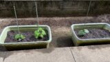 こんな感じになりました。手前がゴーヤ7株、その奥にキュウリ4株を植えました。