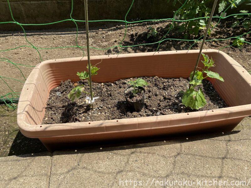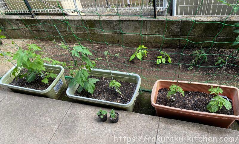 去年ゴーヤを育てた土からこぼれ種でゴーヤが2株生えてきました。それを育苗ポットで育てています。上記写真のプランター中央においてあるポットはこぼれ種のゴーヤです。
