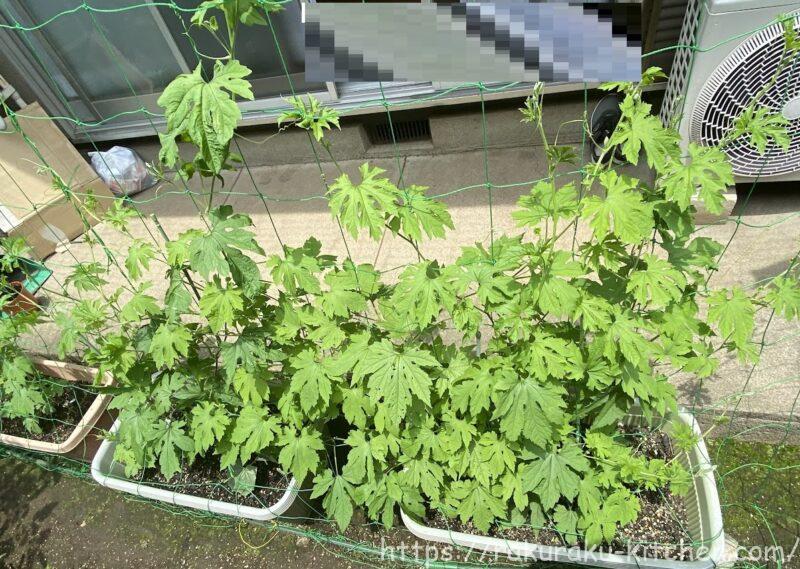 去年までは支柱を組み合わせてその上にネットを張っていましたが、今年は支柱は使わず、ベランダからネットを垂らすだけの簡易的なネットにしてみました。