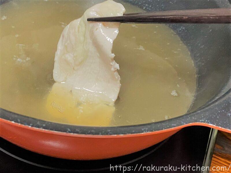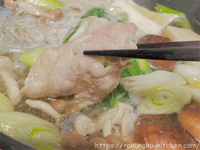 スープを煮立たせて、鶏肉を白くなるくらいにしゃぶしゃぶします。薄いのであっという間です。