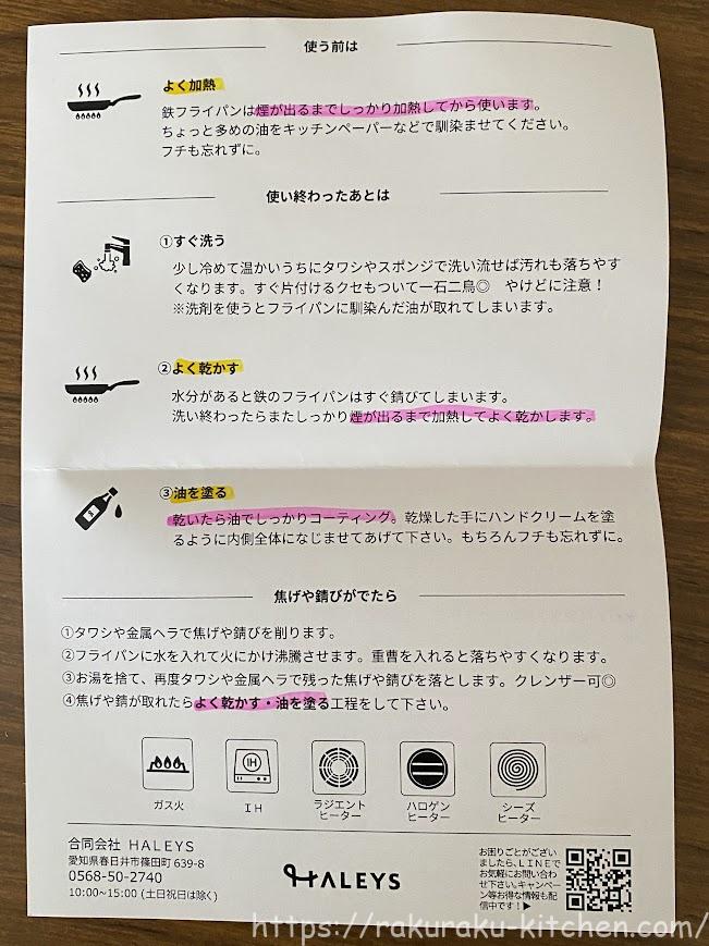 鉄フライパン初心者でもわかるように、使い方が一から書かれている説明が同封されています。楽天の商品ページにも写真付きで詳しい解説があるので、そちらと合わせて読めば完璧です。