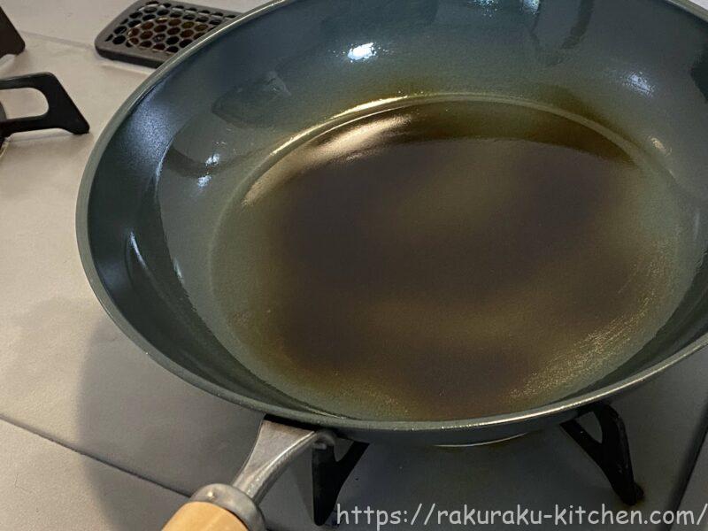③乾いたらキッチンペーパーで油をフライパンの内側全体に馴染ませてコーティングします。