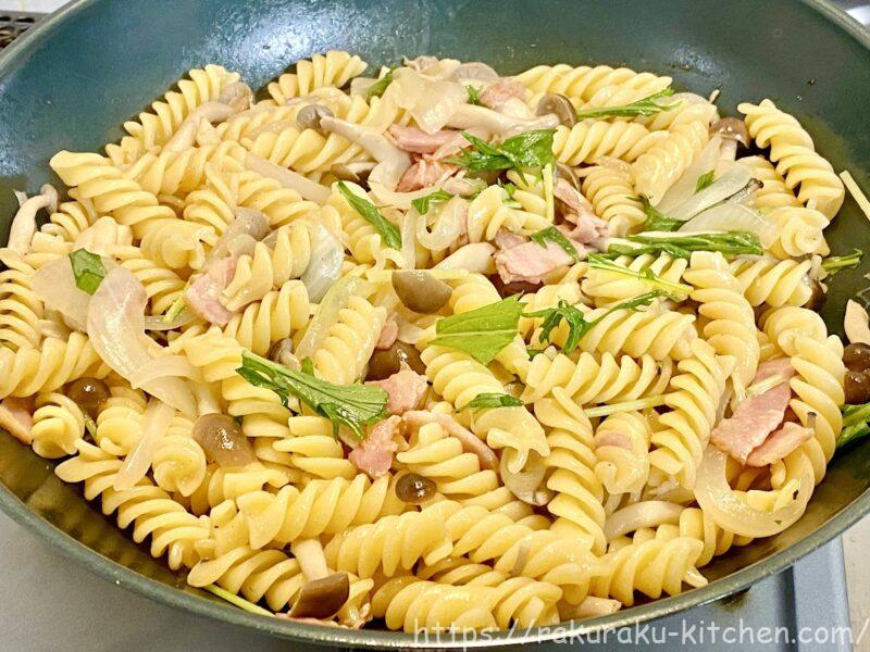 パスタはくっつくかと思ったら、全然くっつかずに調理できました。少量の油を敷いておけばくっつかずに調理できます。