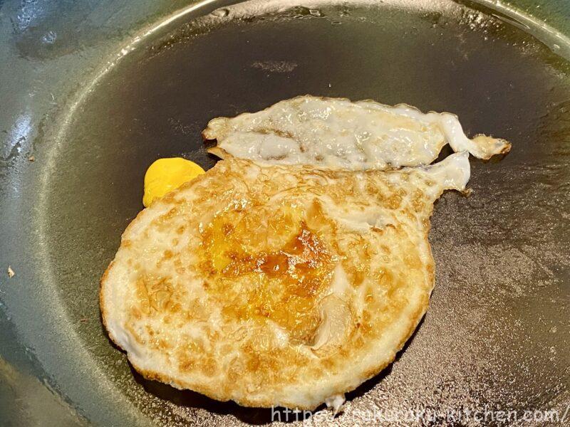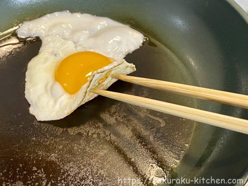 まずは目玉焼きを焼いてみましたが、箸でもするっと裏返すことができました。鉄フライパンだといい感じに焼き目がつきます。