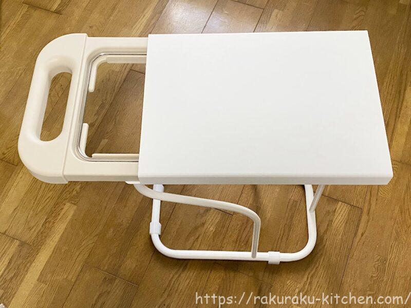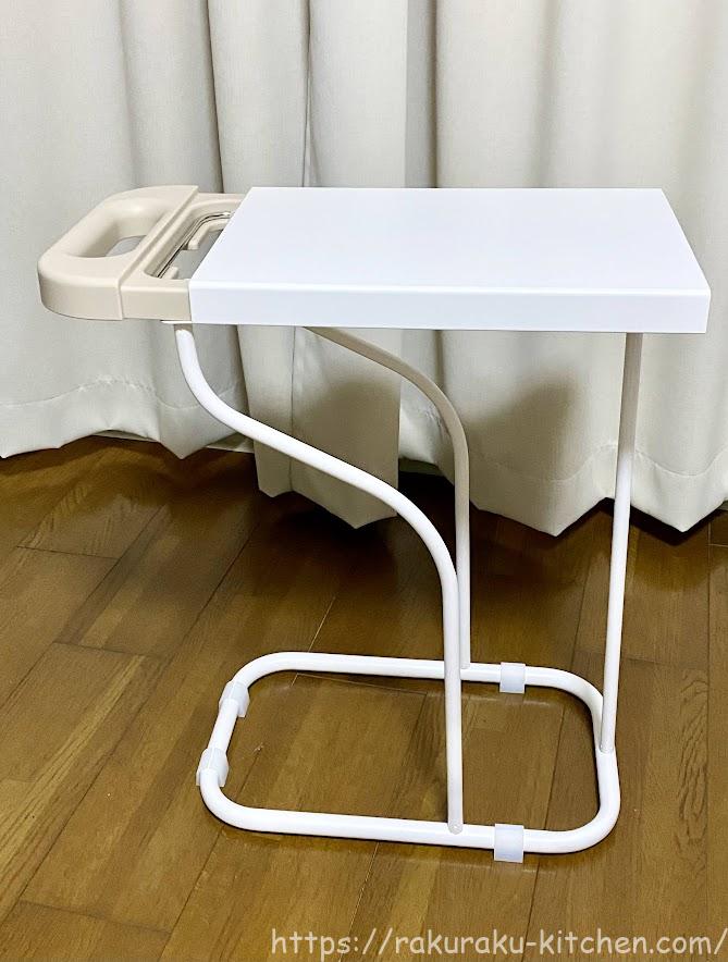 横から見るとこのような形です。上の台にはモノを置くことができます。クッション脚が土台フレームの4箇所にあるので、安定性向上&設置面へのキズ付き防止になります。