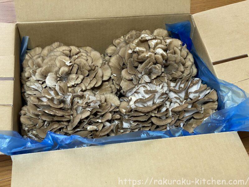 箱を開けると舞茸がぎっしりつまっていて(大きな舞茸が4株)、舞茸の香りが漂ってきました。