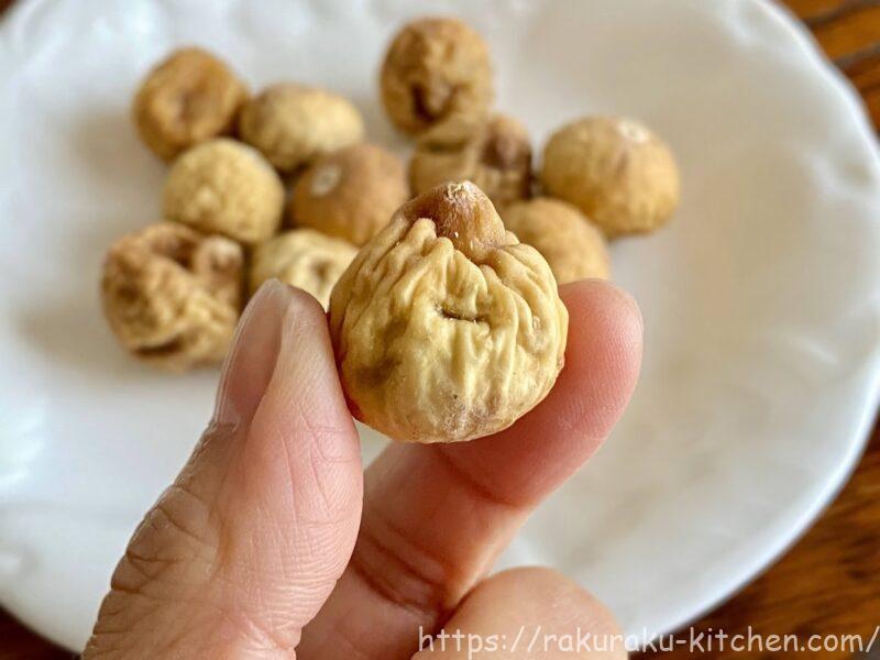 一般的なドライイチジクは半生状態で、噛むとべちゃーっとしていますが、この小粒イチジクはカラットしていて、固めです。