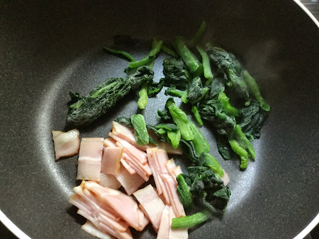 3.フライパンにベーコンとほうれん草を投入して炒める。冷凍ホウレンソウはカットされているので使い勝手がよいです。