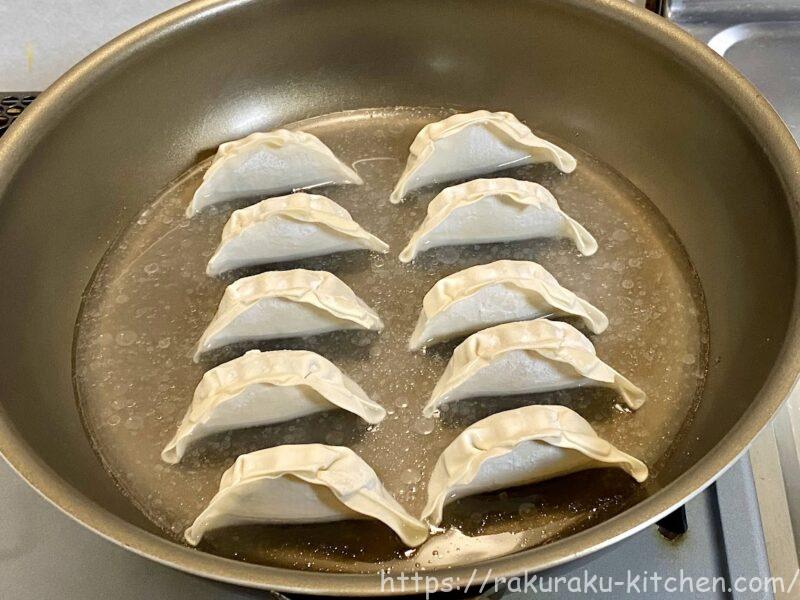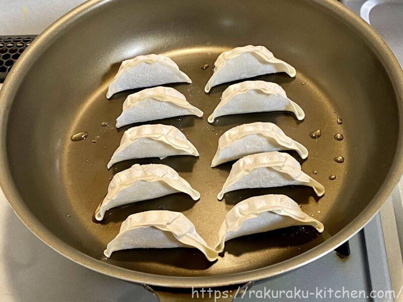 ①フライパンを温めて、油を入れて、凍ったままの餃子を並べます。