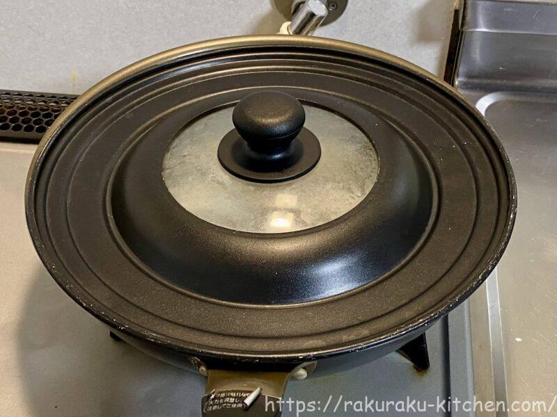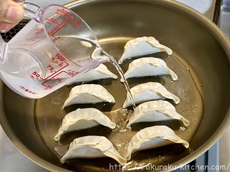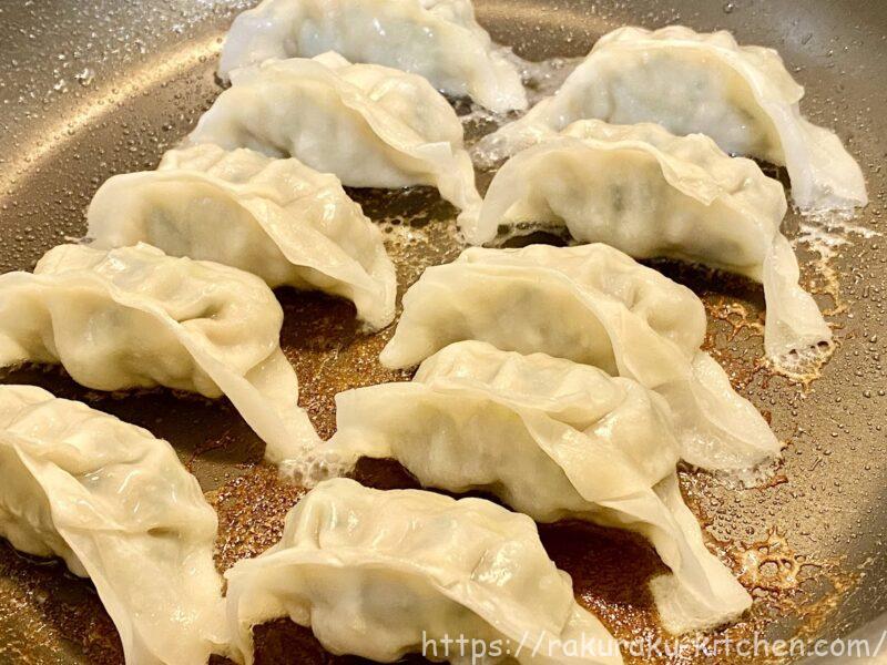 ④水が引けたら火を弱め、少量の油を餃子の周りに注ぎ入れて焼き上げます