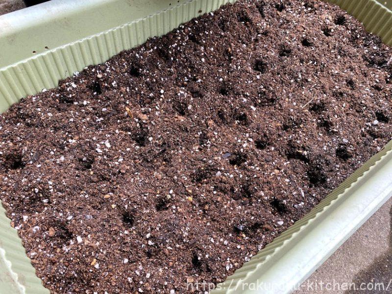 やや大きめのプランターに培養土を入れ、種を植える穴をあけて、1つの穴の中に種を3粒程度適当に入れて土をかぶせました。