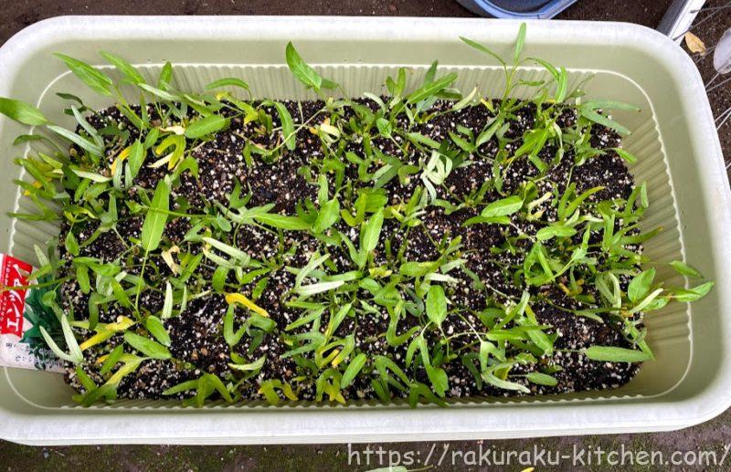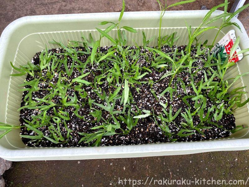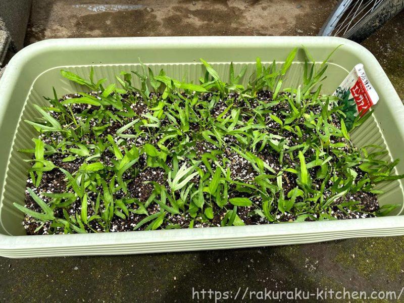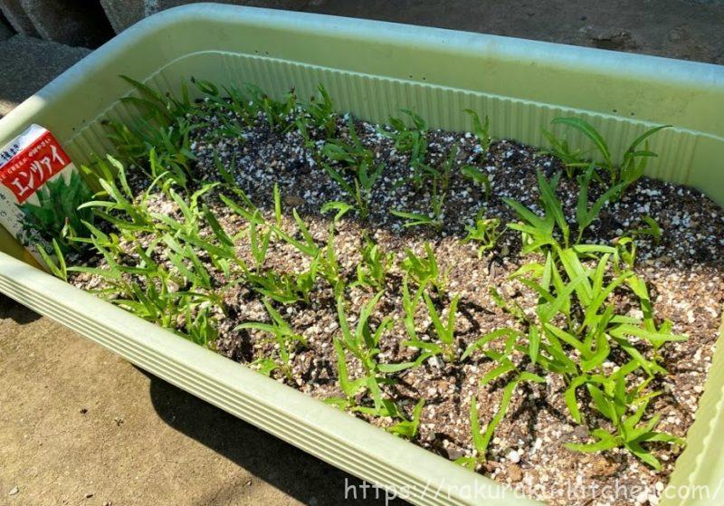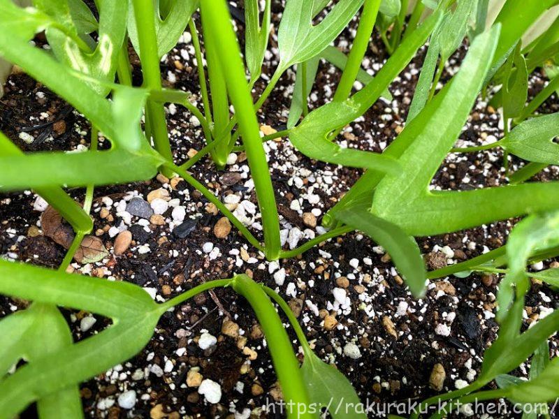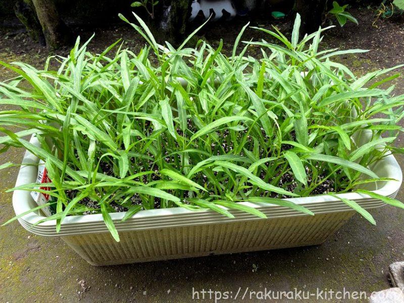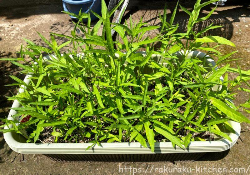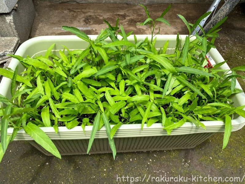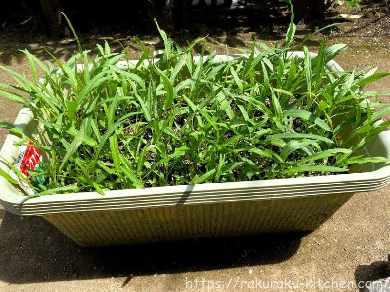 本格的な太い空心菜を育てる場合には、間引いて、株数を少なくしますが、このまま放置して、プランター内でボーボーにして、収獲します(笑)。密集させて育てると細い空心菜になるので柔らかくて美味しいです!
