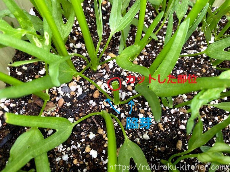 空心菜は茎の部分を切っても、下に脇芽が生えてくるので、何回も収獲できます。