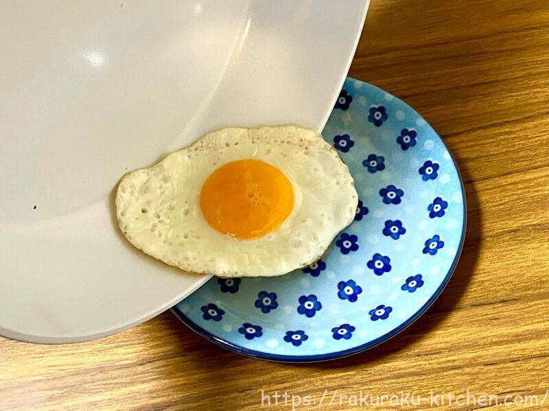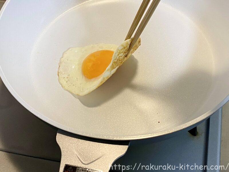 下記は目玉焼きを焼いたときの写真ですが、少量の油をひくだけで全然こびりつきません。表面はカリカリにできます。
