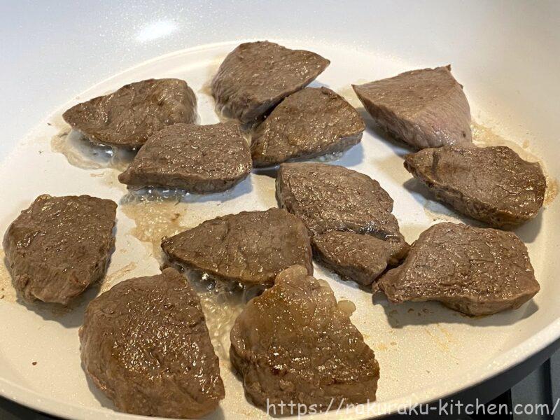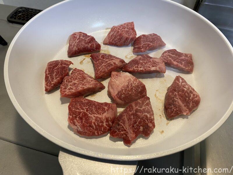 セラミックコーティングのフライパンはステーキ肉などじっくりと火をいれたり料理に適しています。熱ムラがなく、肉を均一に焼くことができます。