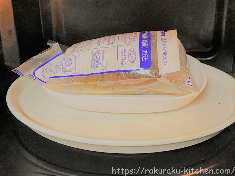 電子レンジの場合はお皿にのせて温めると袋が膨らみます。