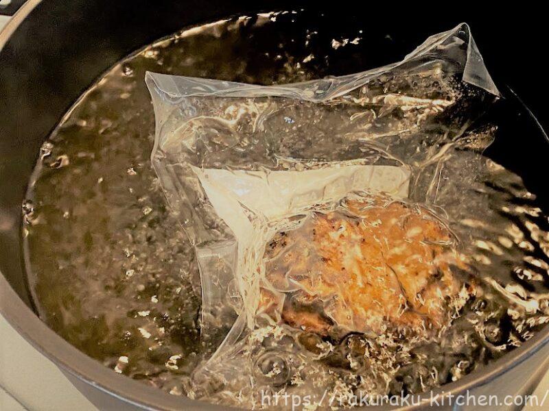 ナイフで切ると中から肉汁が流れ出て、とってもジューシーです。湯煎だけでこんなに美味しくできるとは驚きです。