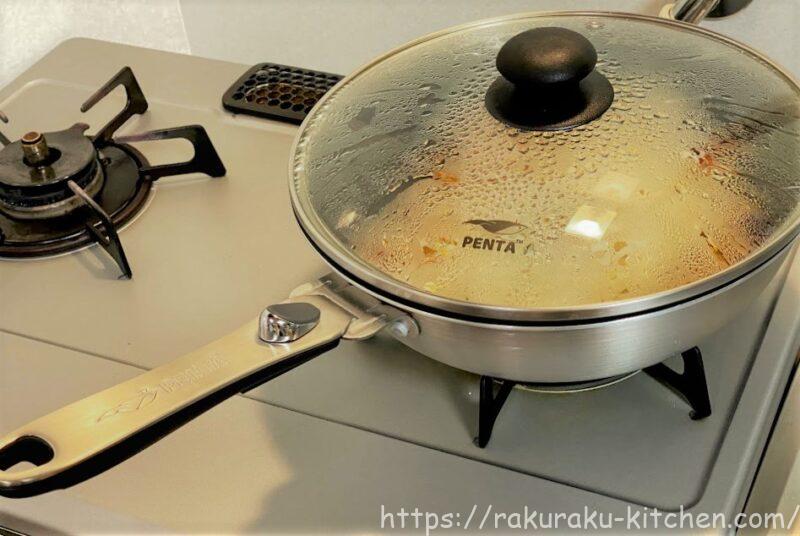 ペンタの取っ手はフライパンに直接挟むタイプではないので、取っ手をつけたままでも蓋が完全に閉まります。