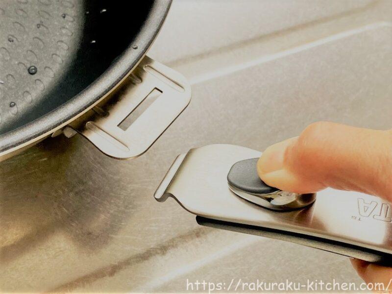 取っ手が取り外しできるフライパンの多くは、取っ手を直接フライパンのフチに挟むので、取っ手をつけた状態だとフタが完全に閉まりません。
