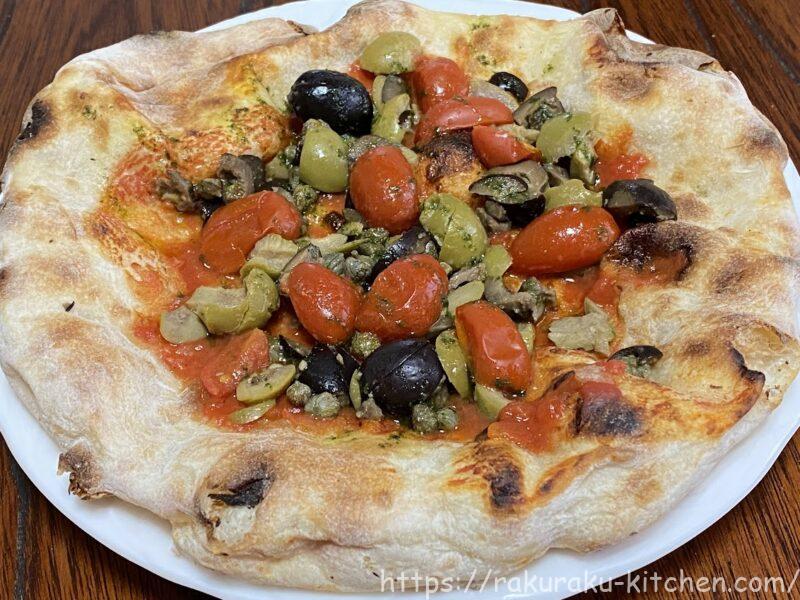 ものすごくたくさんのオリーブがのっています。しっかりめに焼かないと具材が中まで温まらないです(2度焼きしました)。