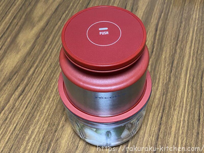 ガラスカップに食材を入れて、カバーと本体をセット。あとはプッシュボタンを押すだけ!