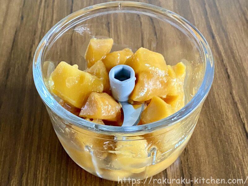 冷凍マンゴーを半解凍して、ガラスカップに入れます。液体も入れないと回らないので、水を加えています。豆乳や牛乳など好みのものをいれてOKです。