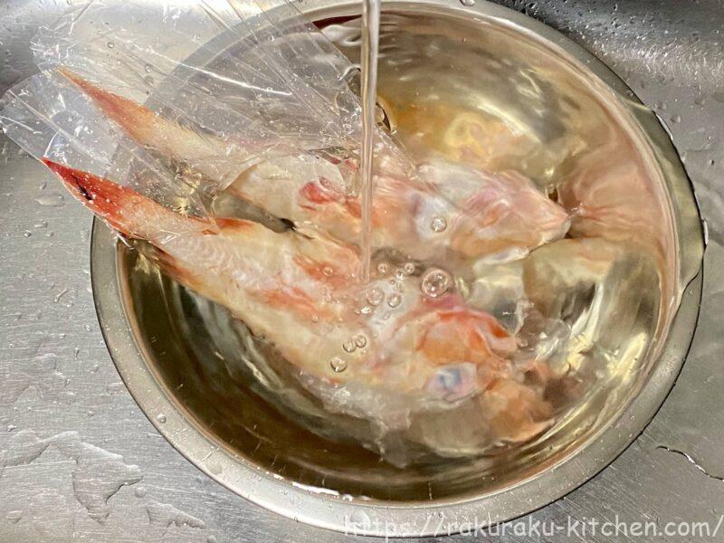 こんな感じで真ふぐが入っているので、流水解凍します。