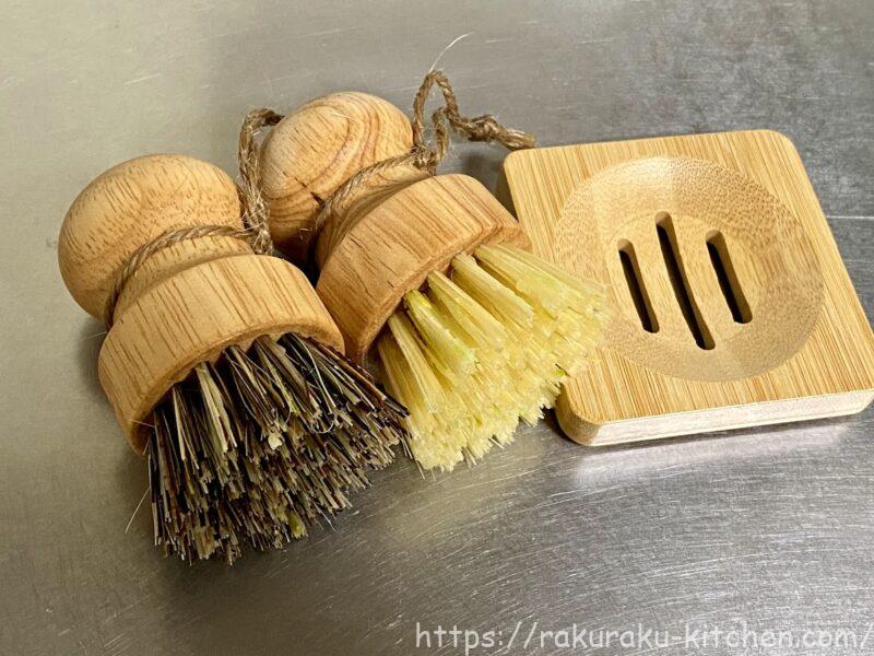 茶色のがパーム混合のブラシ、白いのがサイザル麻のブラシです。パーム混合ブラシの方が固いです。サイザル麻は柔軟性があって傷をつけにくいです。